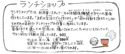 | どんな作業するの? | 1コマ目:みんなで調理や盛り付けします。 2コマ目:お客さんにランチを提供してもらいます。 3コマ目:あと片付け、掃除、買物です。 |