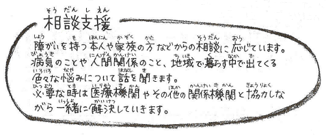 | 障害福祉サービス等の利用計画の作成(計画相談支援) | ホームヘルプなど福祉サービスを利用したいが、どうしたらいいのか分からない、どこに行けばいいのか分からないという方、利用目的や利用頻度などを伺い、これからの生活のことも考えながら一緒に計画を立てて、引き受けてくれる事業を探し利用につなげていきます。 |