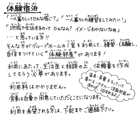①まずはご連絡いただき、相談の予約をお願いします。 ②見学をしてもらいます。 ③次に日中の数時間を部屋ですごして、慣れてください。 ④1泊から始めて、連続最大3泊まで宿泊できます。 |